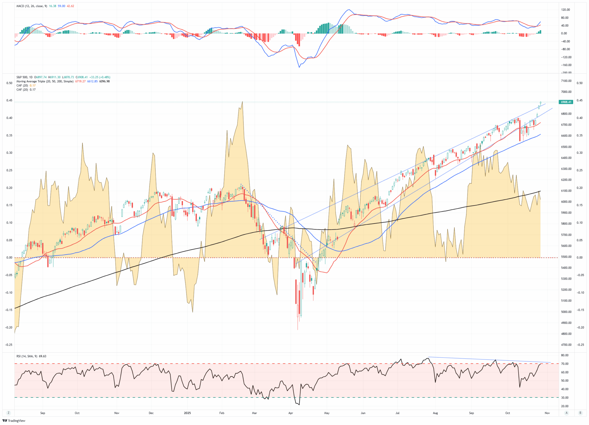 Yesterday, we touched on the earnings season and why the end-of-year run might be stronger than many think. The market is accelerating to the upside, posting the largest 4-day advance we have seen since the reversal of the “Liberation Day” selloff. However, with the market breaking out of the bullish trend channel and momentum triggering a new “buy signal,” the bulls remain in control of the narrative for now.