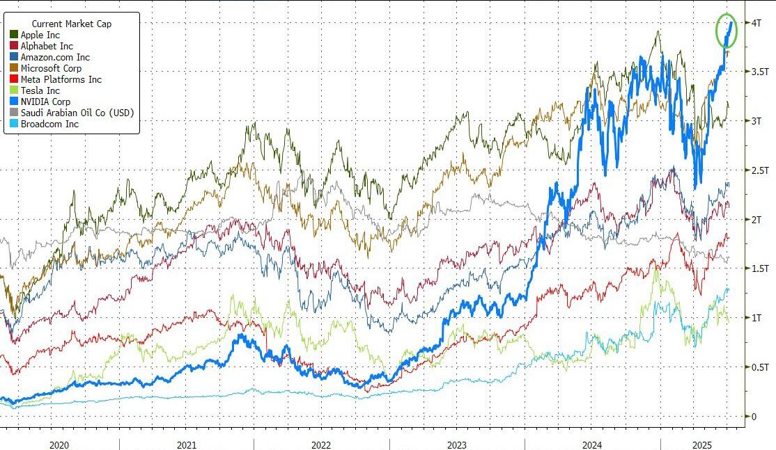 After plunging by over $1 trillion during the Liberation Day chaos (and DeepSeek), NVDA has soared back by over $1.5 trillion from the May lows to reach a 4 handle for the first time, surging past MSFT.