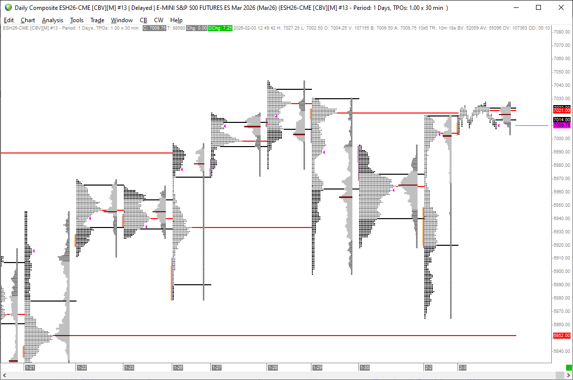 The market closed with an elongated price structure, recovering much of the previous week’s decline with strong bullish momentum. For bias, it makes sense to focus on the volume profile, with the POC around 7002 acting as the key reference level. As long as price holds above it, the level can be treated as support and a potential buying area. A break below would shift the bias to bearish, turning that same level into resistance.