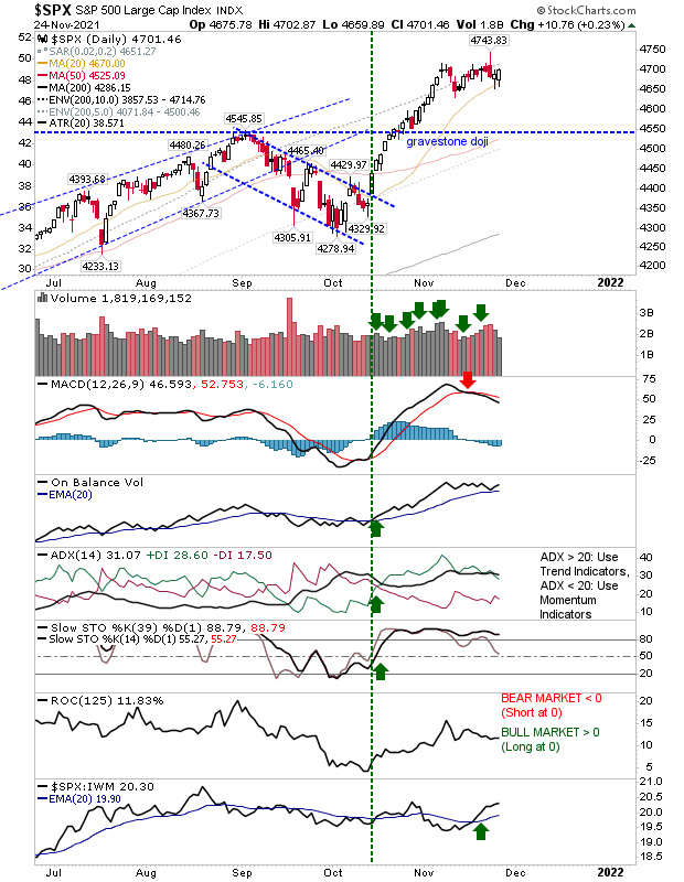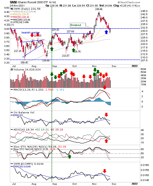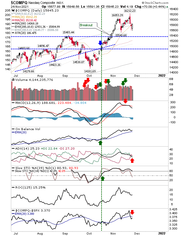 What this means for other indices remains to be seen. The S&P was able to rally from its 20-day MA, but the proximity of this moving average to what was a sharp reversal on Monday might not protect it for too long. However, the index is trading well above breakout support of 4,545, so even if there was an undercut of its 20-day MA it could still come out with a positive even if selling extended in this index. The slowly rising 50-day MA is an alternative support level to watch in the coming weeks. Technicals are mostly positive. The MACD 'sell' is positioned well above the bullish zero line and has the makings for a pullback rather than a selloff. The sharp improvement in relative strength against Small Caps is another big tick in its favor.