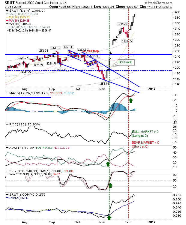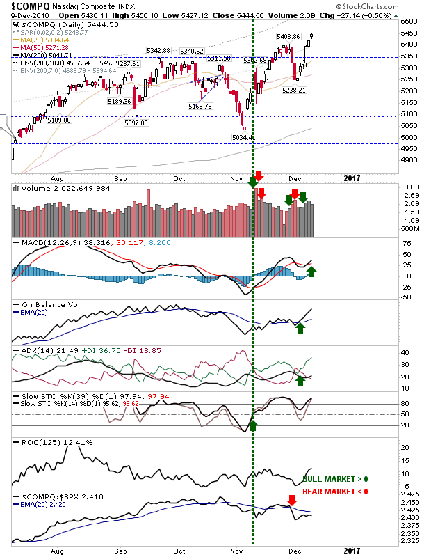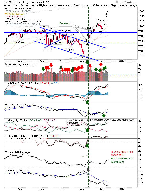 The S&P had a solid finish on Friday and a positive start in early pre-market action. Buying volume has eased over Thursday and Friday, but this slowdown hasn't expressed itself in price action (yet). Technicals are all healthy.
