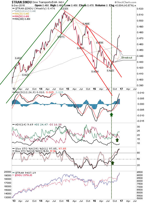 While oil has seen big gains in the overnight session, Transports have had a great second half of the year. This has seen breakouts in two channels, so traders can now look to buying pullbacks for the first time since 2014.