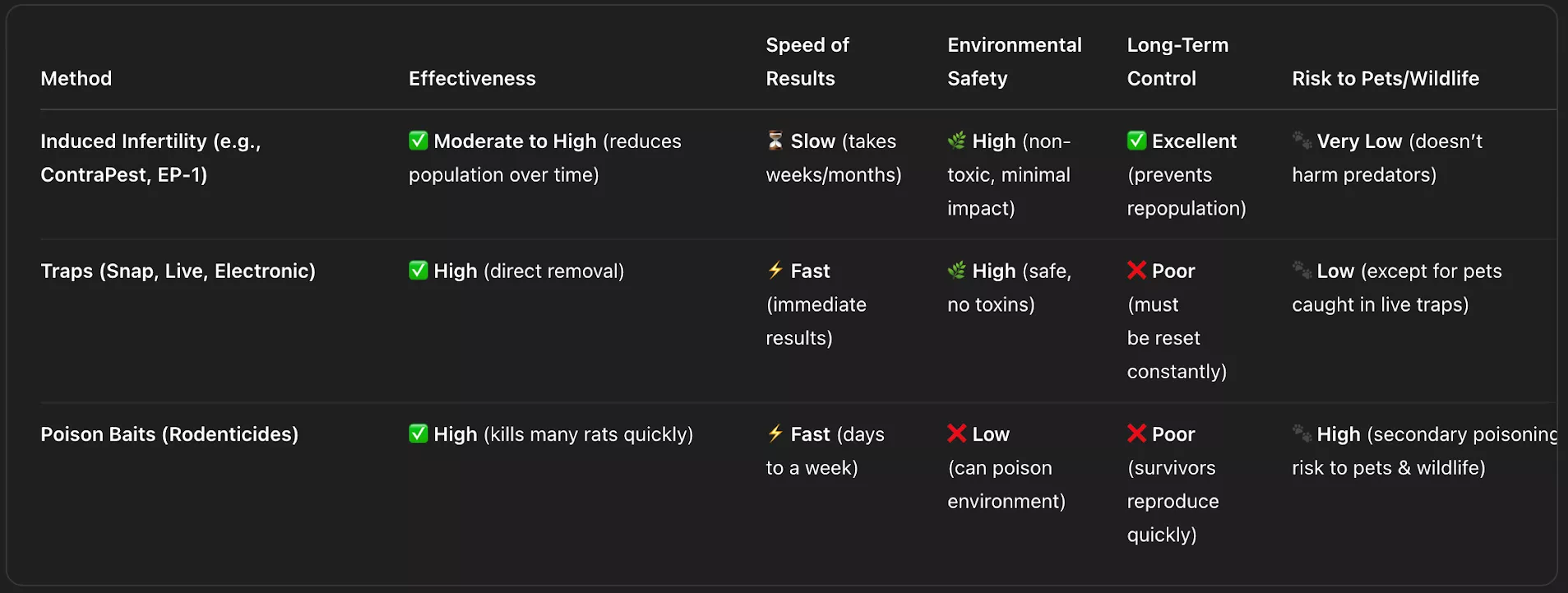 How do we control rat infestations? From my own experience, I have tried every method out there. Traps - nasty, needs manual removal, and rats are way too smart to fall into traps after a few catches; remove their food/water sources - cumbersome, way too much work, and they always find things to eat; sealing holes, controlling nests - also cumbersome, and rats find ways to circumvent these; poisons - I have pets, and poisons can harm animals that you don’t want to harm, plus they are often ineffective because rats are way too smart, and also, if a rat dies in some hole near the house, you can smell it for days. Bottomline: rat infestations are almost impossible to control.