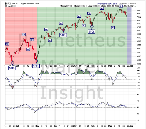 We are 8 sessions into the beta phase decline of the of the cycle following the short-term cycle low (STCL) on January 29. A quick rebound followed by an extended alpha phase rally would reconfirm the current bullish translation and forecast additional gains. Alternatively, an extended beta phase decline that returns to the STCL in January at 3,694 would suggest that cycle translation is in question. The window during which the next STCL is likely to occur is now through April 1, with our best estimate being in the March 26 to April 1 range.