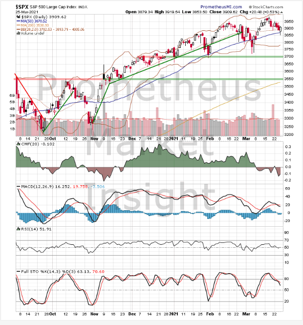 The index closed moderately higher today, moving up toward previous highs of the uptrend from 2020. Technical indicators are effectively neutral overall, suggesting that direction is in question.