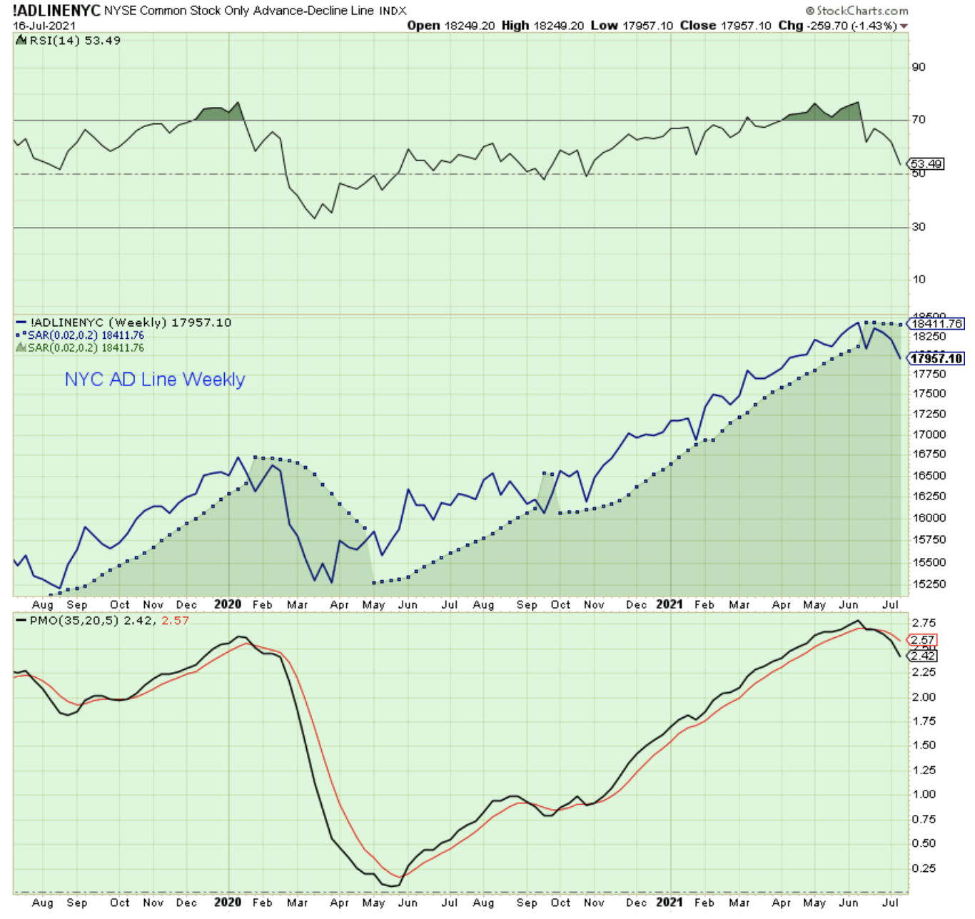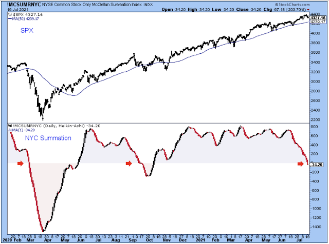 Another indication that a medium-term correction may occur is this chart of the NYC summation which just turned negative this past week. The dips into negative have been signs of a larger pullback.
