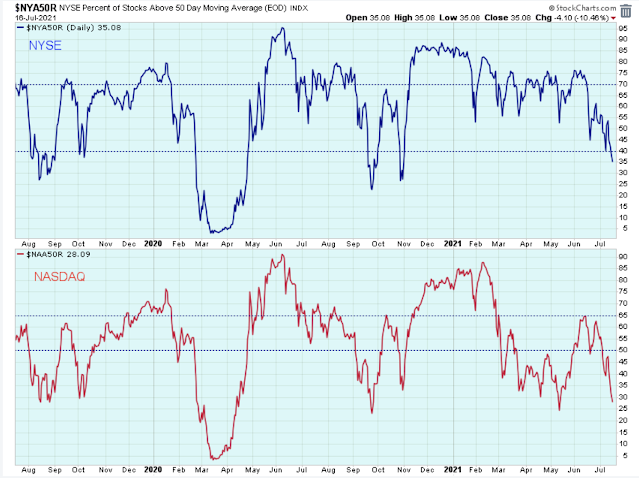 As mentioned earlier, usually I'd use the PMO but since that indicator isn't working well at the moment, I am choosing instead to use the number of stocks above the 50-day average, which is shown below for the major indexes.