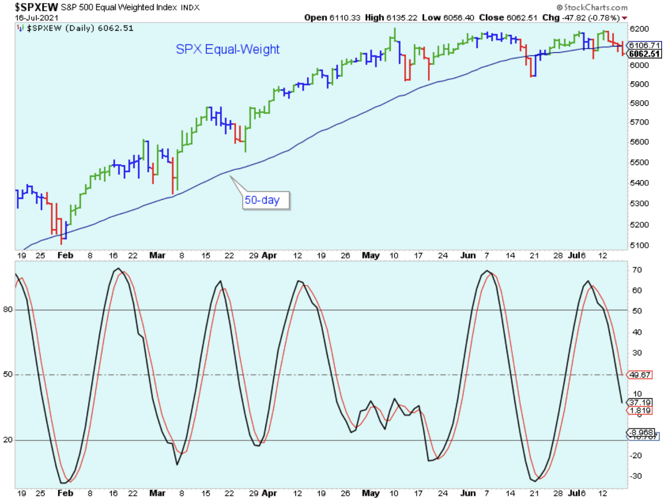 The daily chart shown below of the SPX equal-weight was my favorite from last week, but it is now my least favorite because it is making me look bad. Last week I showed it as a very bullish setup, but now it shows a bearish breakdown below the trendline.