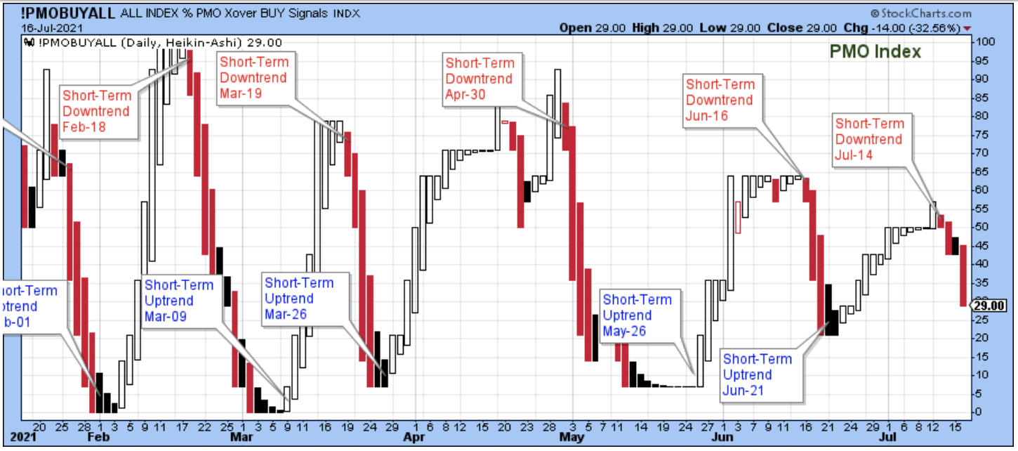 A short-term downtrend started on Tuesday, July 14. The downtrend began with the PMO index near the 50-level, which is unusual because a downtrend will usually begin with the index near the top of its range.