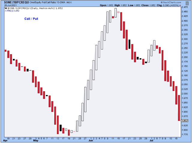 Below is a look at the 10-day call/put ratio. This used to be one of my favorite indicators, but like the PMO, it seems out-of-sync with the market lately. Or, better stated, stocks within the general market are so out-of-sync with each other that it is making some of the best indicators much less useful.