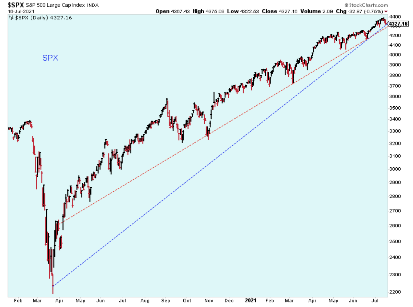 Third, some of the charts are hinting at a larger correction. The chart below shows the uptrend line for the SPX since the COVID-19 collapse in early 2020. I'm not sure exactly how to draw the trend, but in either case even a short-term pull back could break the trendline, which would be a set up for a bounce up to resistance below the trend.