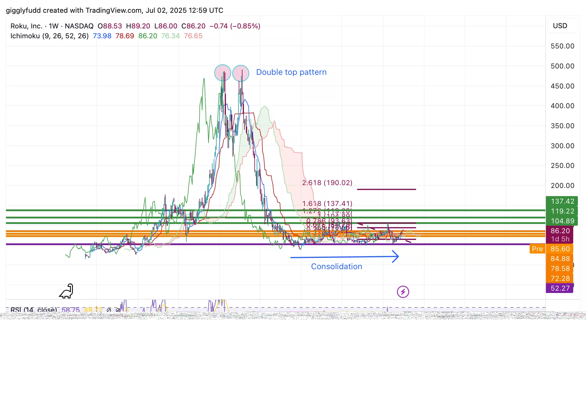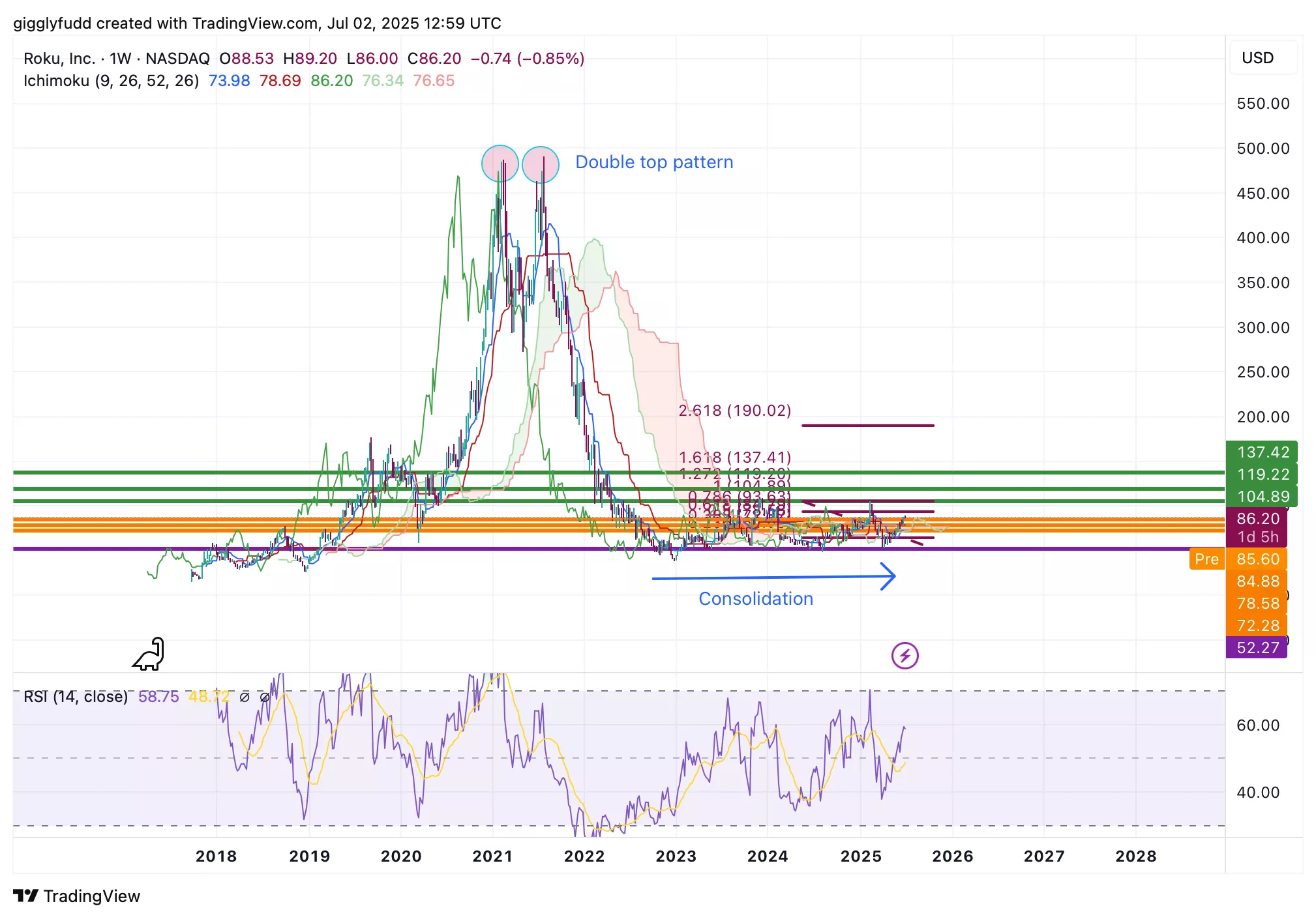 We can see that Roku performed exceptionally well during the COVID-19 pandemic, reaching highs of around $490. However, shares began plummeting in 2021, forming a double top pattern which is a classic bearish reversal. Since then, the stock has struggled to recover and has spent the last few years consolidating within a range of $50 to $104.