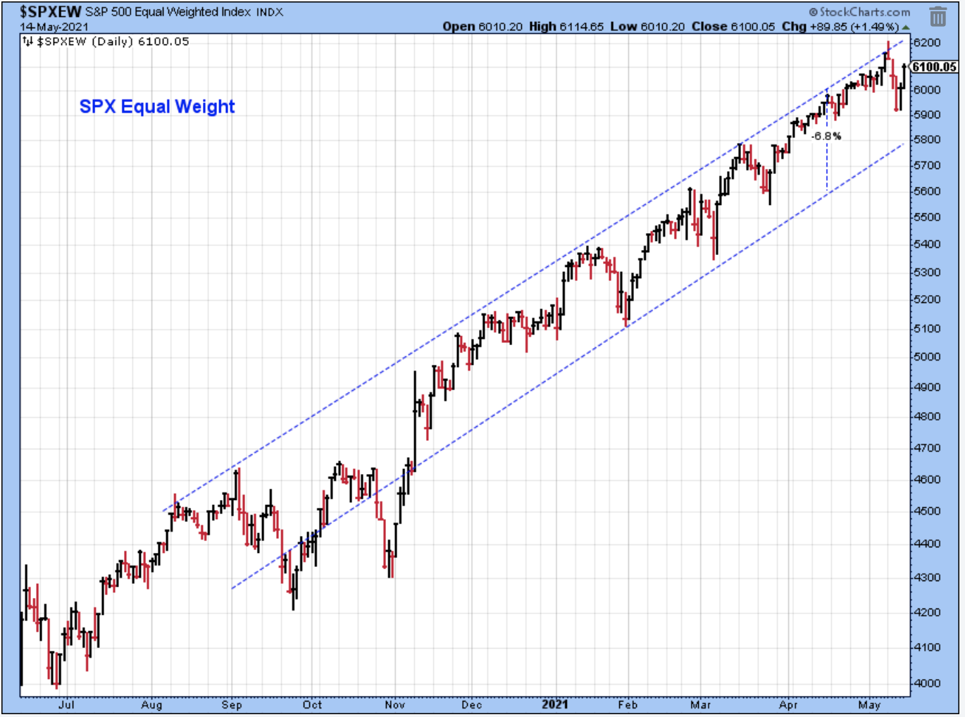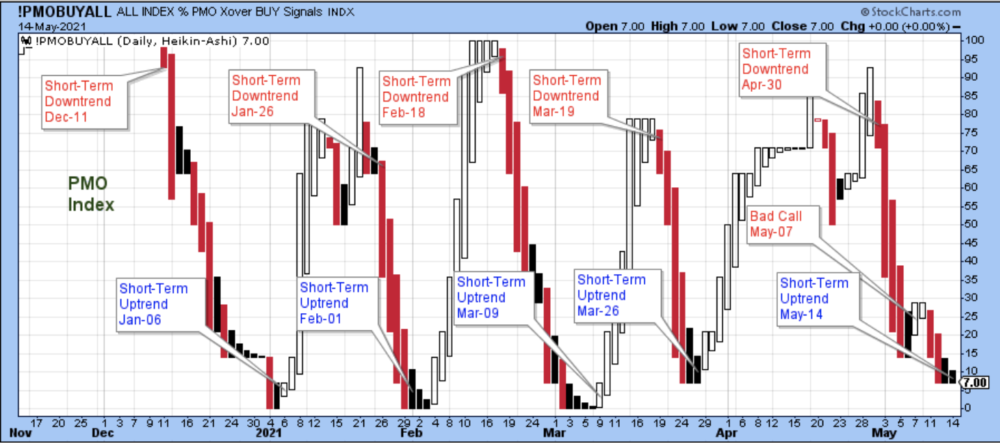 Looking back to Friday, May 7, you can see strong, new high closes for the SPX and the Dow, but a weak doji close well below a new high for the Nasdaq. It is very difficult to believe a market is trending lower when two of the three averages are closing at new highs, but then again, such weakness in the third average is a bearish divergence. So, it was a judgment call.