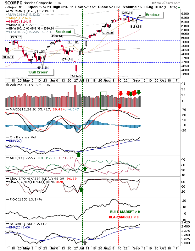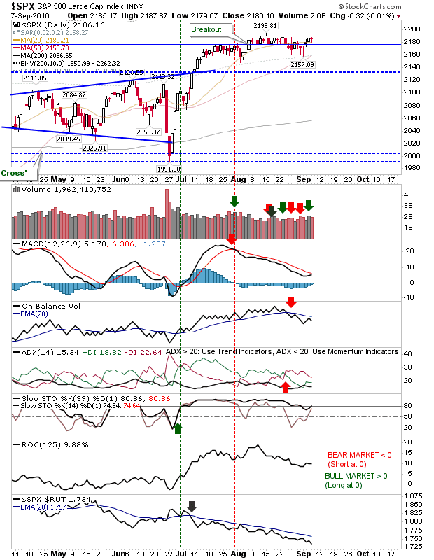 Large Caps had the quietest day of the lead indices, effectively holding station. However, the action does appear to favour bulls (speaking as someone with a non-confident, but minimal risk, short position in play).