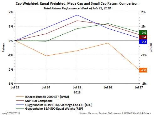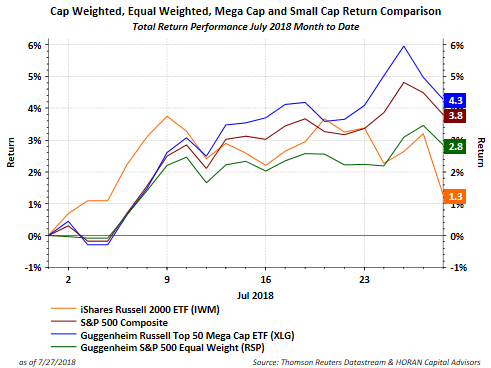 With the month of July coming to a close, investors will want to evaluate whether this weakness in small caps, which has been the market leader this year, is a sign of broader weakness as August and September close out summer. Earnings continue to exceed expectations though. Howard Silverblatt of S&P Dow Jones Indices noted Friday in a tweet, "To date 217 S&P 500 issues have reported their quarterly results for Q2,’18, with an amazing 84% beat rate (historically 67%): 183 beat, 20 miss, 14 meet; 156 of 214 beat on sales (72.9%)." At the end of the day, stock prices tend to follow earnings and both the top and bottom lines for companies continue to look strong.