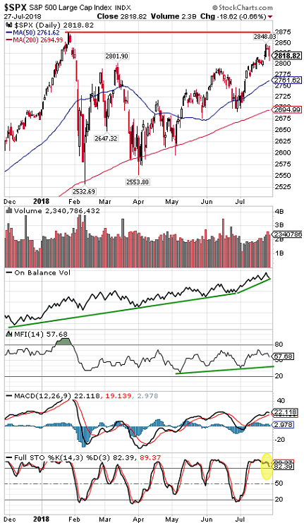 Confirming this strength were a few economic reports last week, durable goods and GDP. Although the headline durable goods orders of 1.0% missed expectations of 3.2%, strength was seen in core capital goods and unfilled orders. Core capital goods rose .6% and exceeded the .5% consensus expectation. Overall this is a strong report. Then on Friday the advance estimate of second quarter GDP was reported at an annual rate of 4.1%. The last 4%+ GDP print was Q3 2014 when the rate was 4.9%. According to the Commerce Department on the Q2 2018 GDP report, "The acceleration in real GDP growth in the second quarter reflected accelerations in PCE and in exports, a smaller decrease in residential fixed investment, and accelerations in federal government spending and in state and local spending. These movements were partly offset by a downturn in private inventory investment and a deceleration in nonresidential fixed investment. Imports decelerated." The weak economic report for the week was a miss in the existing home sales report which have now been soft for three consecutive months. This is something to keep an eye on.