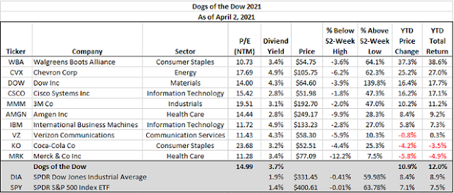 Several factors led to the Dow Dog underperformance. First, the 2020 Dow Dogs held two energy stocks out of the total ten stock portfolio. Exxon Mobil (XOM) was down 36% and Chevron (CVX) was down 29% last year. In the technology space, the two Dogs were IBM and Cisco (CSCO), down 1.2% and down 3.5%, respectively. For 2021 though, the Dow Dogs have jumped out to a strong start up 12.0% versus the SPDR Dow Jones Industrial Average (DIA) up 8.9% and the SPDR S&P 500 Index (SPY) up 7.5% as seen in the below table.