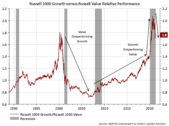 The growth style has dominated value since the end of the 2008/2009 financial crisis. If this recent rotation to value and its outperformance trend continues over the balance of this year, the Dow Dogs strategy may be a winning one in 2021.