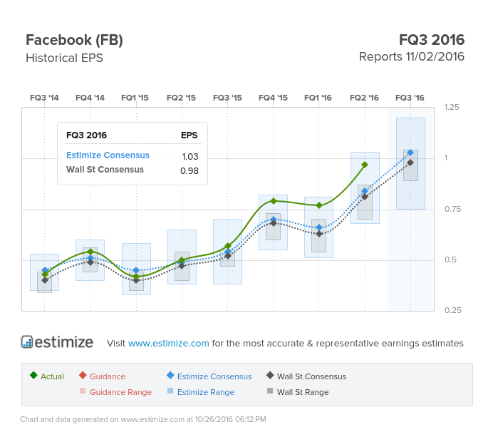 Facebook is still one of the most impressive names in this space despite hitting some speed bumps recently. The social media company continues to top earnings and revenue expectations driven by strength in its mobile platform and strategic acquisitions. The upcoming quarter will be the first to feature sales figures from the highly anticipated Oculus Rift. Virtual reality is expected to be one of the fastest growing sectors, providing a new source of revenue moving forward. This should help offset the blow Facebook is about to take after years of over-inflating its video metrics. This type of deception will certainly have a short-term impact on advertising revenue. Additionally, SnapChat is on pace to become a legitimate threat to Facebook’s core business, sooner rather than later. The Evan Spiegel run company currently boasts 60 million daily users in the U.S. and Canada, about a third of what Facebook has in these markets. Lofty expectations have still been placed on Facebook to blow out its third quarter report. The Estimize consensus is calling for earnings per share of $1.03 on $7.02 billion in revenue. Compared to a year earlier that represents a 76% increase on the bottom line and 55% on the top.