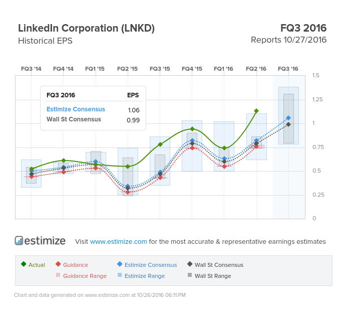 LinkedIn is the largest professional social network to date with no clear competitor in sight. The recent takeover by Microsoft is sure to shake things up but it doesn’t change the fact that LinkedIn is gaining traction. Before the acquisition, LinkedIn’s stock has slowly rebounded from its post FQ4 2015 sell-off that saw the stock get cut in half. Three key metrics investors use to evaluate the company had been steadily improving. They include, talent solutions, marketing solutions and premium subscriptions, all of which climbed double digits from a year earlier. Linkedin is well positioned in the e-learning space with its 2015 acquistion of Lynda.com. The company recently launched LinkedIn Learning, a new product that combines Lynda.com classes with LinkedIn’s social graph. This is determined to help job seekers improve their qualifications and ultimately connect them with the appropriate opportunities. Upward revisions over the past 3 months would suggest analysts are high on LinkedIn this upcoming quarter. The Estimize consensus is calling for earnings per share of $1.06 on $968.32 million in revenue, about 25% higher on both the top and bottom line.