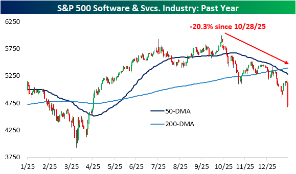 One week ago, we discussed the grim run for software stocks, and flash forward seven days, the picture has only gotten worse. Thursday has been a historically brutal session for the S&P 500's Software & Services industry as it is currently down 8.5% due in no small part to a 12% decline in the industry's (and one of the market's) largest stock: Microsoft (MSFT). Given the steep decline today, the software group is now trading at fresh local lows and has officially surpassed the 20% threshold from the October high to mark a new bear market.
