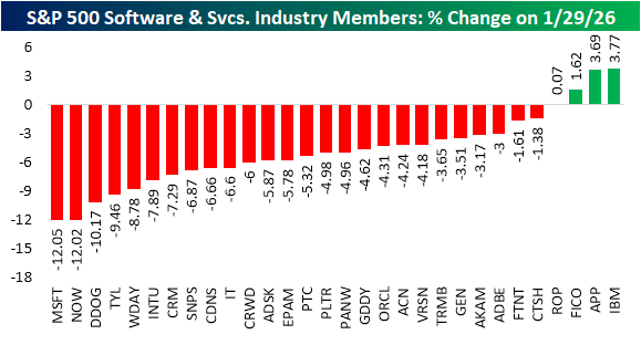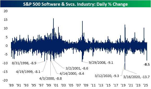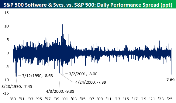 Even more notable is today's decline for software in the context of the broader market. Given Microsoft's (MSFT) huge weight in addition to other heavy hitters such as Oracle (ORCL), Palantir (PLTR), and Salesforce (CRM) to name a few, this industry alone accounts for about a tenth of total S&P 500 weighting. As a result, this group usually moves in the same direction as the rest of the market, especially in the past couple of decades. Today marks a historic disconnect though. The Software & Services industry is underperforming the broader S&P 500 by almost 8 percentage points. There have only been five other days on record with that degree of underperformance. The most recent of those: March 2001.