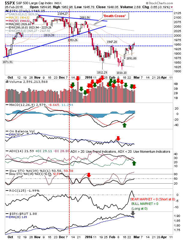 The S&P remained above its 50-day MA as relative performance shifted towards Small Caps, and Rate of Change moved sharply lower. Volume rose to register a distribution day. Bulls will be looking to the 1,891 spike low to hold as a swing low; if not, then 1,810 is back in play.