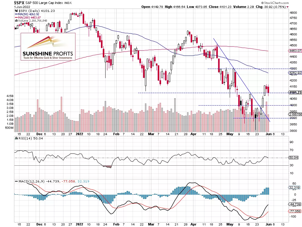 The S&P 500 index lost 0.75% on Wednesday, as it retraced its Friday’s advance after bouncing from the local high of around 4,150. On Tuesday the broad stock market went sideways following the long holiday weekend, as investors took short-term profits off the table. On May 20 it went to the medium-term low of 3,810.32 and it was 1,008.3 points or 20.9% below the Jan. 4 record high of 4,818.62. So technically, the broad stock market entered a bear market territory. There’s still a lot of uncertainty and worries about inflation data, tightening Fed’s monetary policy, and the Russia-Ukraine conflict. Today, the S&P 500 is expected to open 0.4% higher, so we may see more short-term fluctuations.