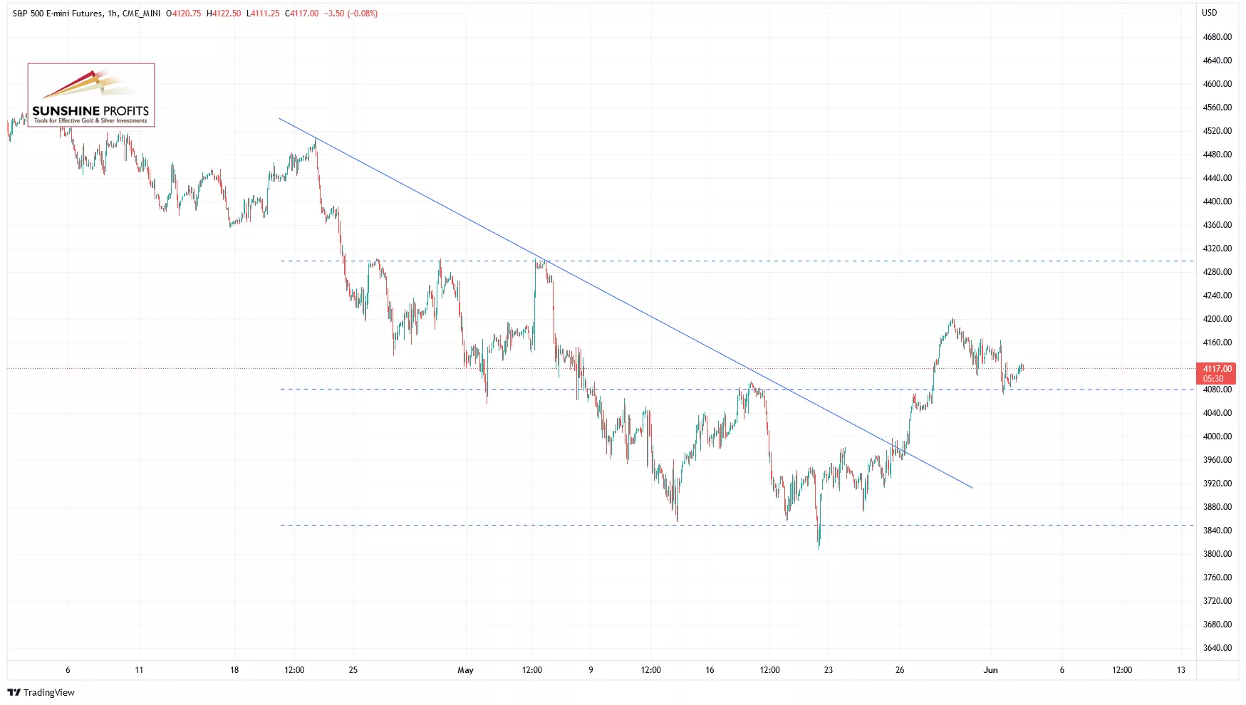 Let’s take a look at the hourly chart of the S&P 500 futures contract. It reached the 4,200 level on Monday, before retracing more than 100 points from the short-term local high. For now, it looks like a correction within an uptrend. (chart by courtesy of http://tradingview.com):