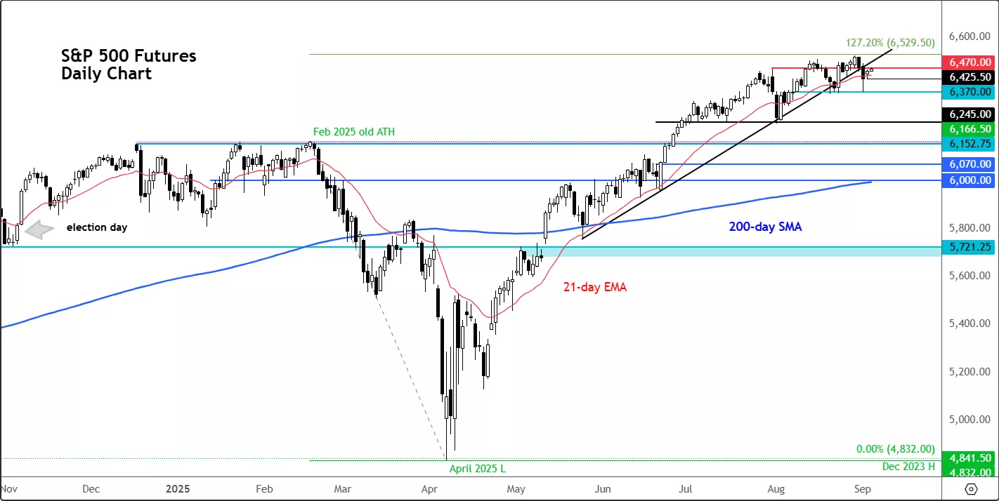 On the upside, there is not much resistance beyond the aforementioned 6470 and 6500 levels, given that we are trading not too far off the recently achieved record high. Round handles like 6,500, 6,600 and Fibonacci extension levels such as 6530 (i.e., the 127.2% extension of the Feb-April downswing) are among the upside targets.
