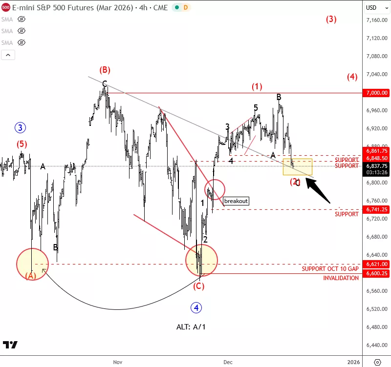 Last week’s Federal Reserve meeting left markets poised for direction, and since then price action has been digesting the outcome in a corrective wave (2) that may find support near 6800 before resuming trend. Buyers appear ready to step back in, consistent with a resumption of the primary uptrend.