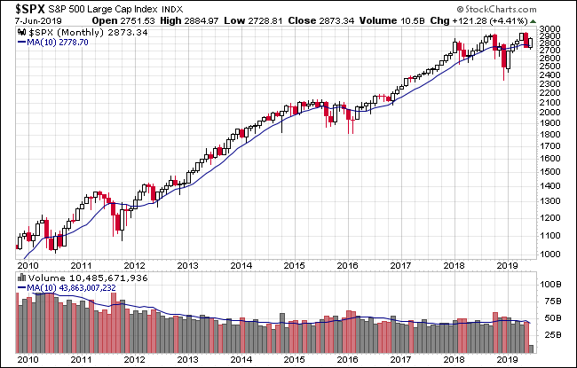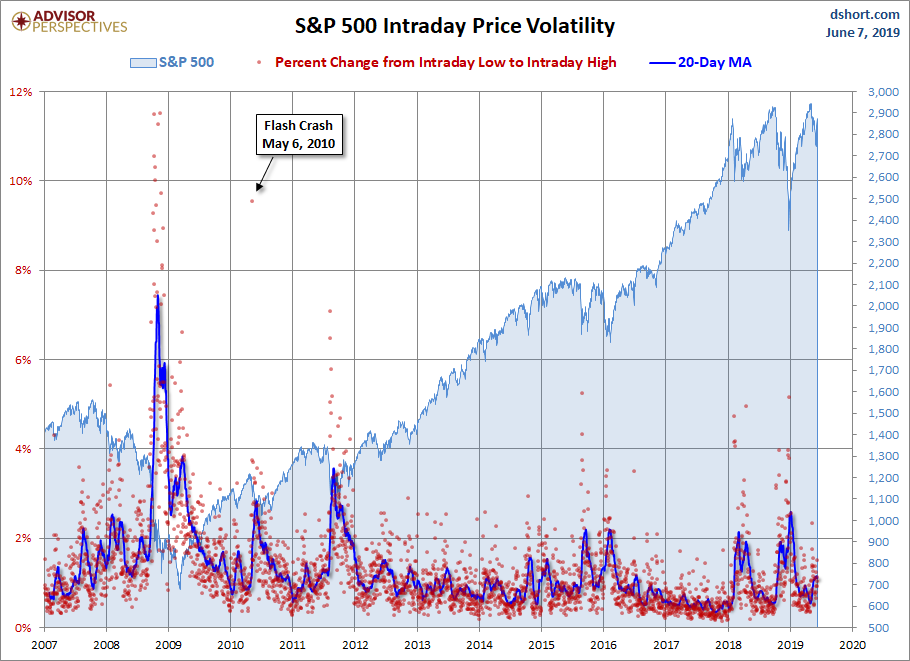 For a sense of the correlation between the closing price and intraday volatility, the chart below overlays the S&P 500 since 2007 with the intraday price range. We've also included a 20-day moving average to help identify trends in volatility.
