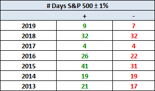 Here's a table with the number of days of a 1% or more change in either direction and the number of days of corrections (down 10% or more from the record high) going back to 2013.