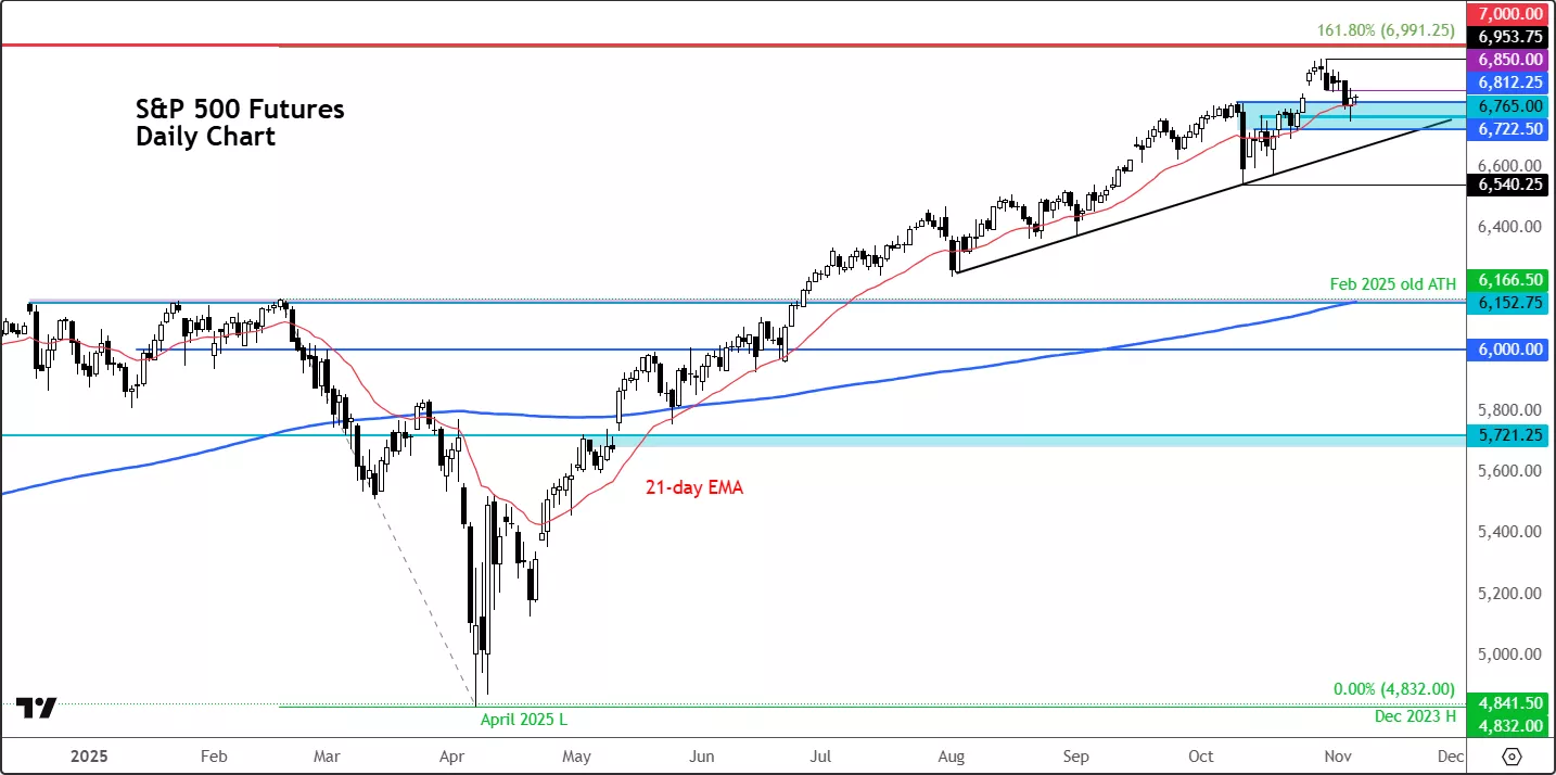From a technical standpoint, the S&P 500 futures chart bounced right where it needed to yesterday. As you can see from the S&P 500 futures daily chart, the area between 6722 to 6765, marks the prior breakout region. In addition to that, the 210-day exponential average also comes into play here. So, the index needed to hold above here to maintain a bullish bias, and judging by yesterday’s bounce here it looks like the bulls have held their own. We they will now need to see is some upside follow-through. If the index can now clear 6850 resistance, then a revisit of the all-time high at 6,953 could be on the cards, possibly as soon as today. Above that? Well, there is the 161.8% Fibonacci extension level at 6991 – this is derived from the last significant downswing that took place between February-April. Slightly higher, you have the psychological-important 7,000 level next, which is where I expect the index to get to in the coming days. But in the event the selling resumes first, then that could open the way towards the next support at 6722 and then the trend line seen slightly lower at around 6665. But my base case scenario for today is that the market will want to push higher.