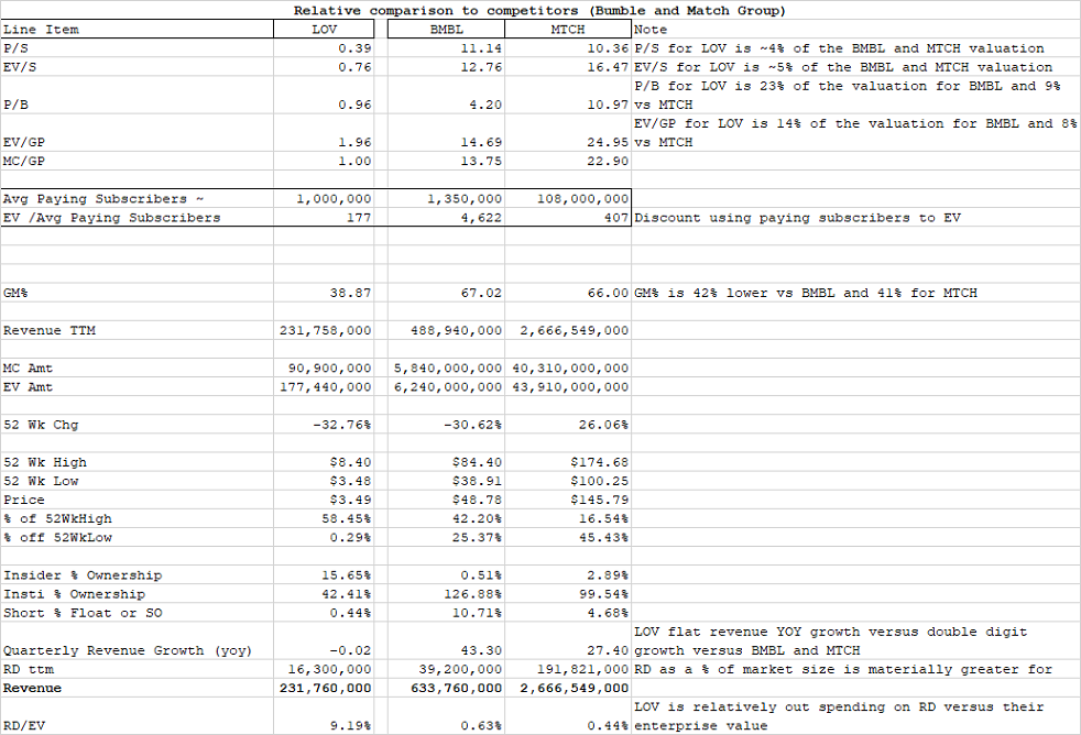 Relative valuation is impressive for LOV. It's a stretch to compare LOV to profitable industry leaders and much larger BMBL(Bumble) and MTCH (Match Group). But, Spark's price or enterprise to sales, gross profit, book value is startling at a ~90% lower valuation(see below). Lower valuation per subscriber versus MTCH and BMBL. Further, LOV is near its 52 weeks low and outspent on research and development relative to its market value for the prior two years.