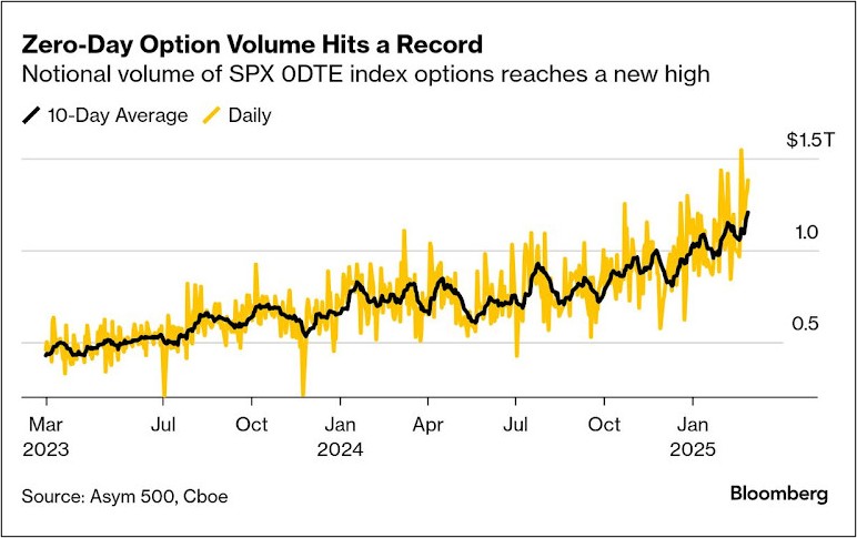 According to Bloomberg, these 0DTE options continue to reach record highs. On the chart below (via Bloomberg), the yellow line represents the daily notional volume of 0DTE’s on the S&P 500 and the black link is the 10-day average.