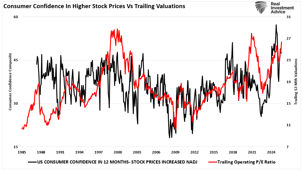 But that is what happens during market manias. As the crowd chases momentum and dismisses warnings, it pushes prices beyond what the underlying assets justify. This is what is called “valuation expansion.” As shown below, valuations, in the short term, reflect consumer (investor) sentiment. The chart shows the correlation between consumers’ expectations of higher prices in 12 months versus trailing 12-month valuations.