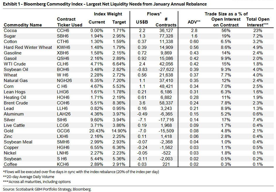Starting on Thursday and lasting five days, commodity investors will face a predictable wave of volatility from index rebalancing. This short period differs from other days, when commodity prices are driven by typical technical and fundamental market forces. Once a year, the major commodity indices such as the S&P Goldman Sachs Commodity Index (GSCI) and the Bloomberg Commodity Index (BCOM) publish their index target weights. As shown in the BCOM Index below, the table lists the 2026 target weight for each commodity and its current weight. Funds that track the index must rebalance to reflect these new weights.