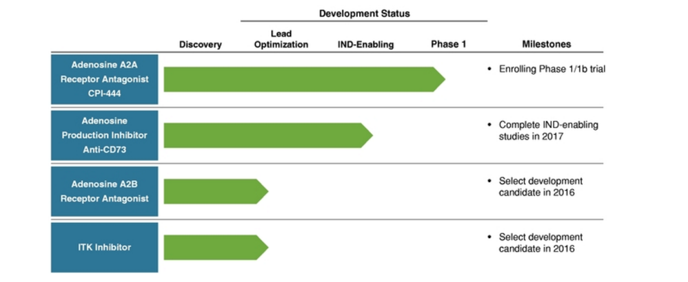 In January 2016, Corvus Pharmaceuticals began enrolling patients in an expansion trial for CPI-444, and this trial will test the safety, tolerability, efficacy and biomarkers in several types of solid tumors. The trial will investigate the drug as a single agent and in combination with an investigational cancer immunotherapy treatment by Genentech.