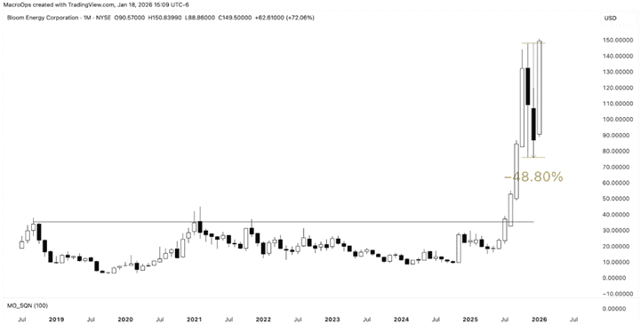 10. Bloom Energy (BE) has a a similar pattern (chart below is a monthly). It aslo reversed nearly 50% from its October top and recently traded back to new all-time highs. This chart is headed much higher.