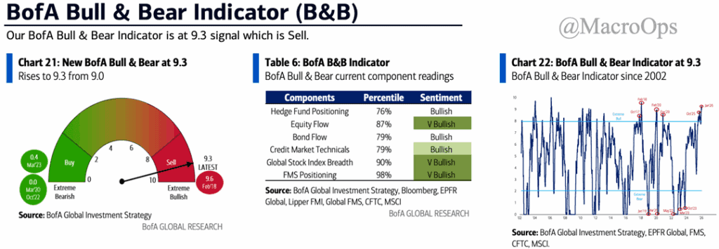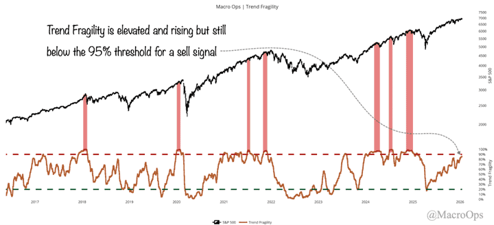 4. The trend is up, but sentiment and positioning are stretched. BofA’s Bull & Bear indicator is firmly in sell signal territory, while our Trend Fragility composite is at 86% and rising — a TF sell signal triggers when it crosses above 95%. This tells me the market will likely hit an air pocket later next month.