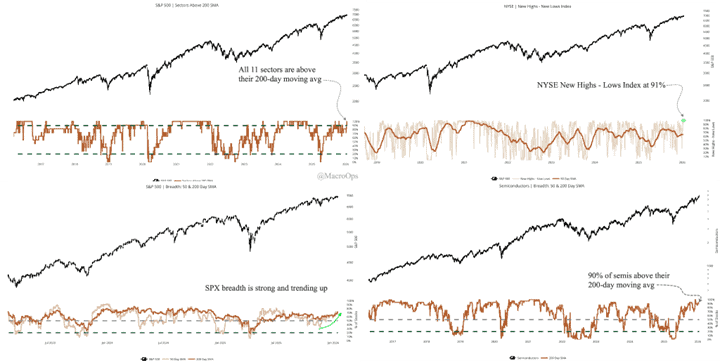 We also have all 11 sectors trading above their 200-day moving averages, which historically leads to higher than average forward returns. The NYSE New Highs-Lows just climbed above 90%, which is bullish for 3-month forward returns. The percent of semis trading above their 200dma is at 90% and rising, which is… you get the picture.
