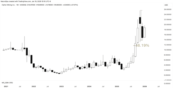 12. Cipher Mining (CIFR) with a similar pattern. CIFR is a US-based large-scale BTC miner focused on ultra low cost mining operations powered by long-term fixed-price energy contracts.