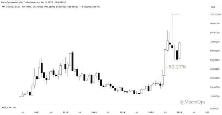 9. Industrials, materials, and real estate are the best looking sectors at the moment, so that’s where the majority of our focus is. MP Materials Corp (MP), a name we previously owned (and which I pitched in these pages when it was trading sub $20), is a play we’re once again interested in. It sold off 50% from its October high and is putting in a strong monthly reversal candle.