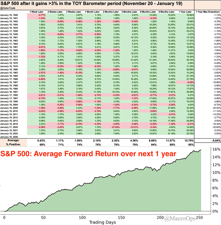 Historically, $SPX was higher 36 out of 38 times a year later, with an average gain of +15.8%