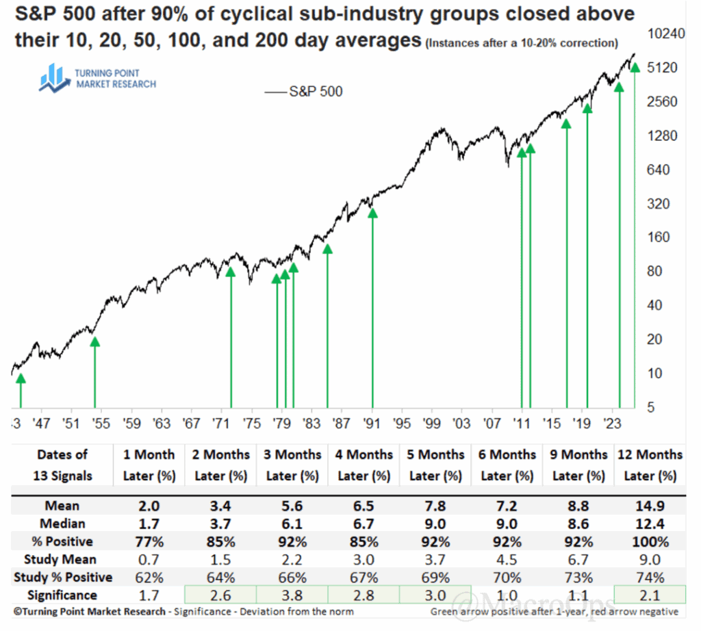 8. Dean Christians at the excellent Turning Point Markets Research recently shared this great study with subs noting that over 90% of cyclical sub-industry groups closed above their 10, 20, 50, 100, and 200 day averages and how this historically foretells strong forward returns for the S&P.