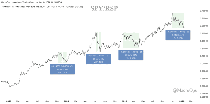 2. The story for the past few months has been rotation. The cap-weighted index has gone sideways, weighed down by Mag-7, while the equal-weighted index is trending to new highs. We can see there have been three other extended periods of rotation during the current bull trend, starting in 23’.