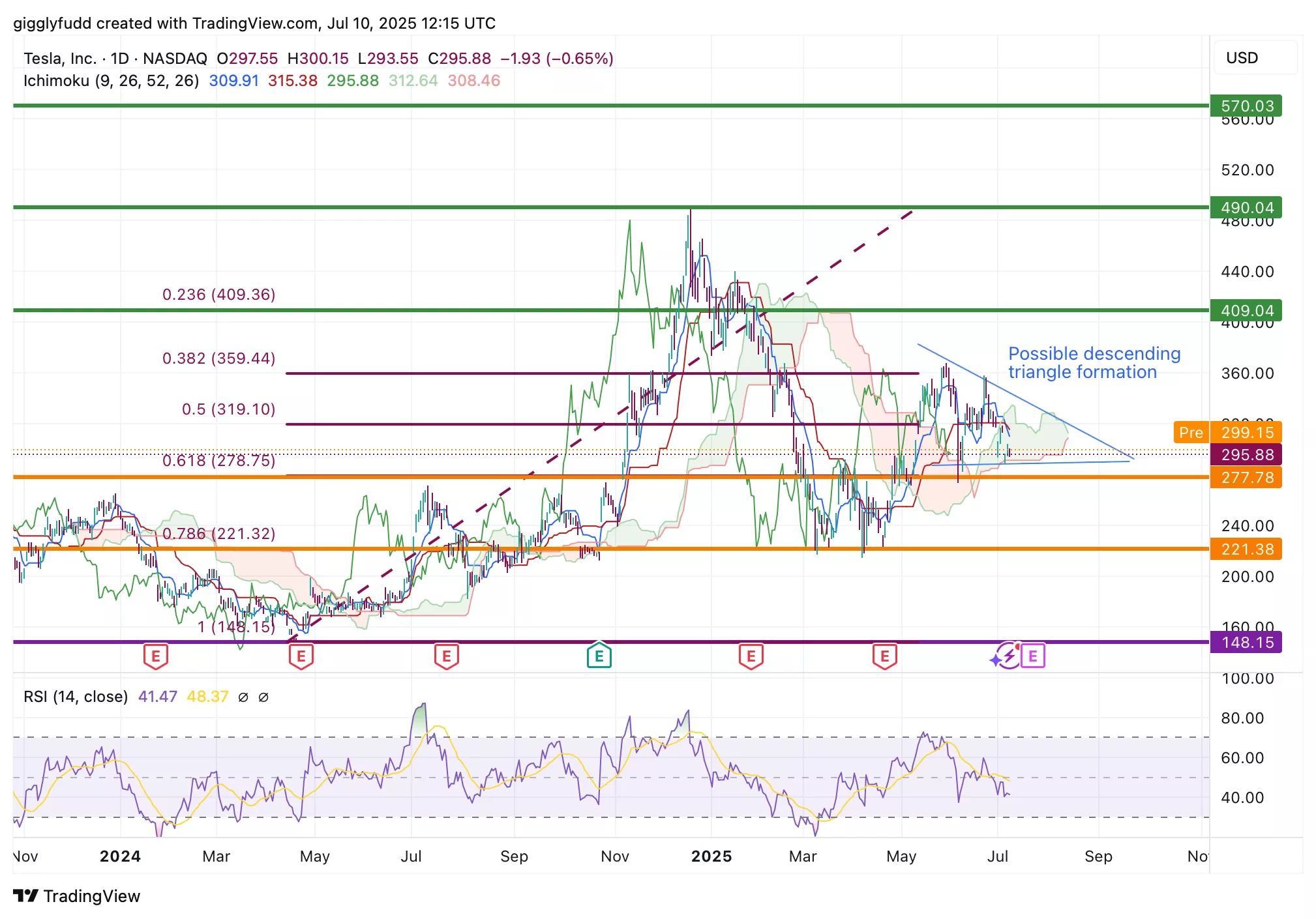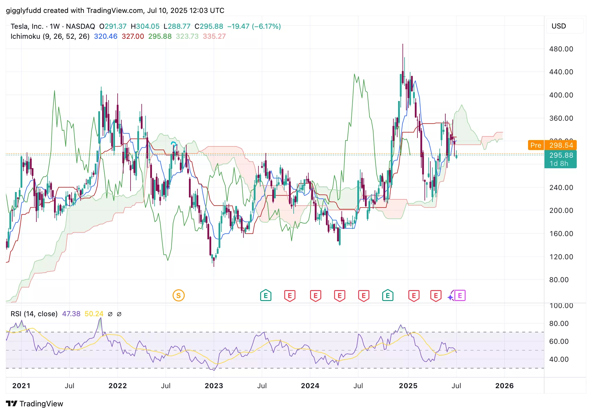 Since 2021, the weekly chart shows that TSLA stock has experienced significant choppiness and volatility, dropping as low as 101 in January 2023. In 2024, it saw a strong uptrend, reaching a high of around $488 before undergoing a sharp pullback.