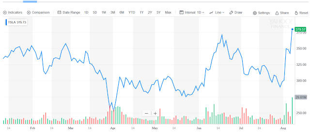 Tesla stock prior close was around $342. After his tweet, Tesla stock shot up almost 11% to close at $379.57 today and rising to $383 after hours at this writing.