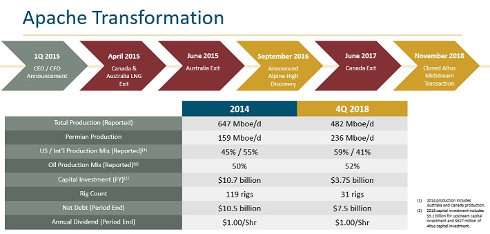 In November, Apache teamed up with Kayne Anderson Acquisition and formed Altus Midstream, an entity that will be funding future midstream investment needs at Alpine High, an area with promising growth prospects. Apache expects to grow its output at Alpine High from 44,000 barrels per day in 2018 to 160,000-180,000 barrels per day by 2020. Apache owns 71% of Altus Midstream.